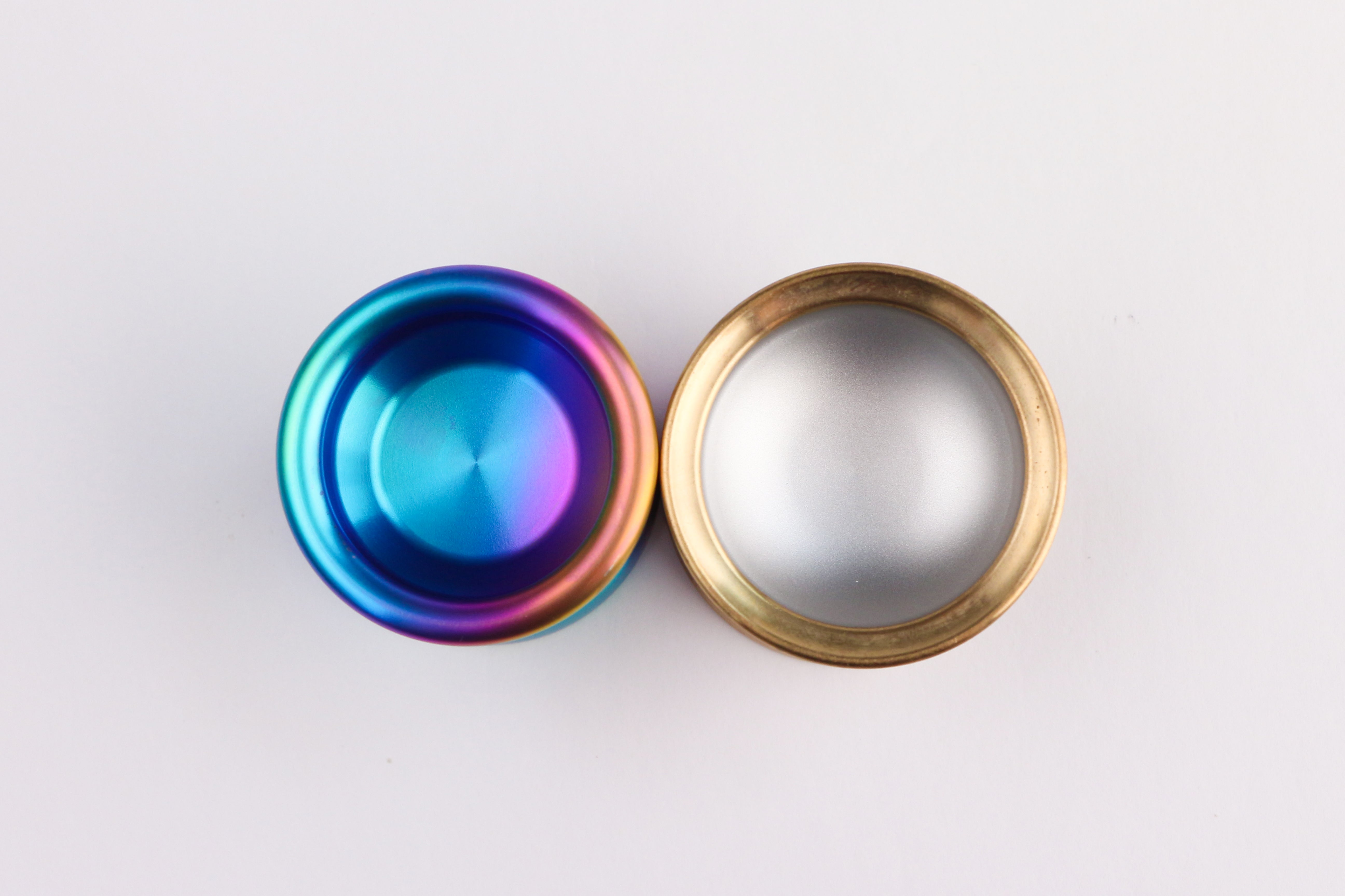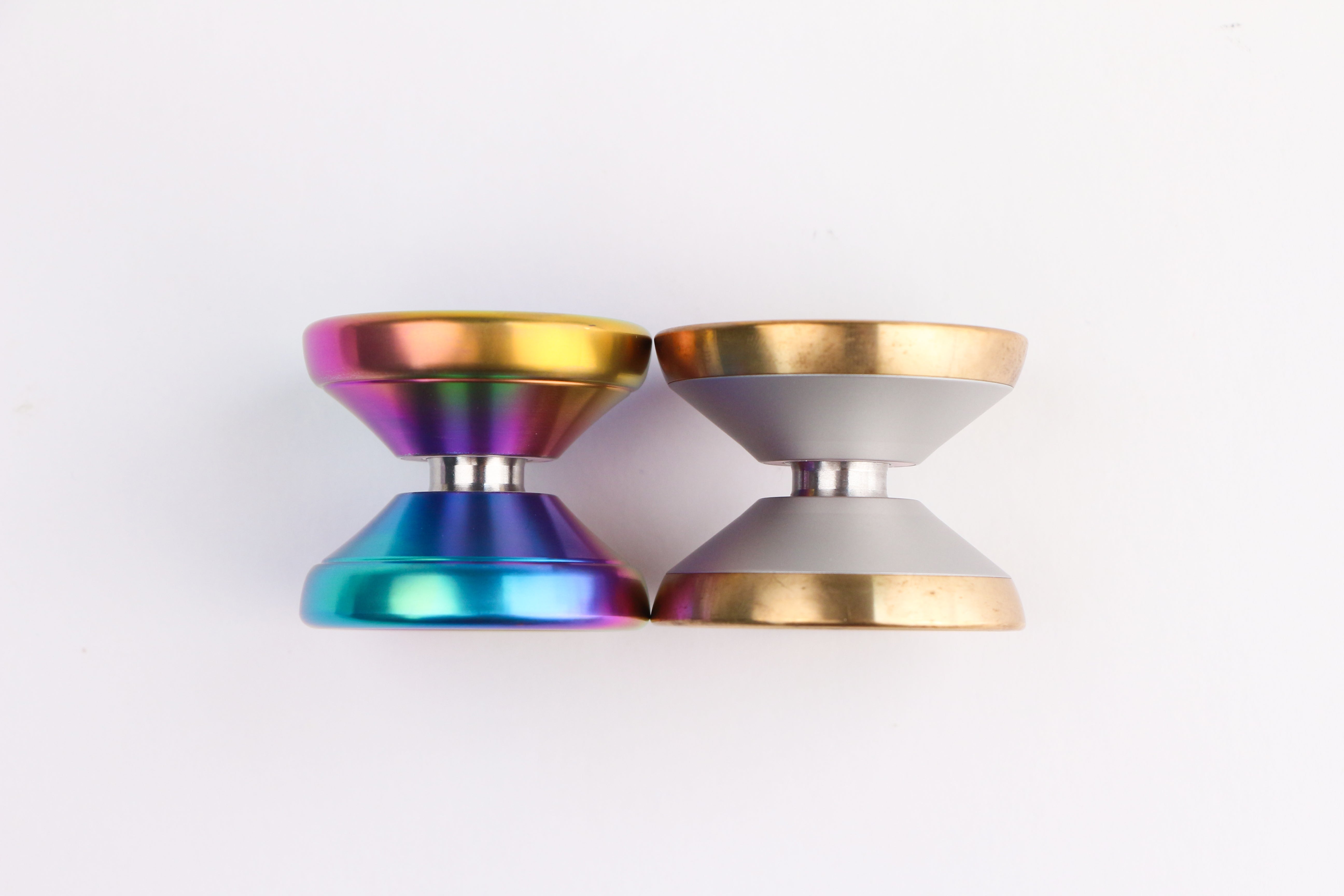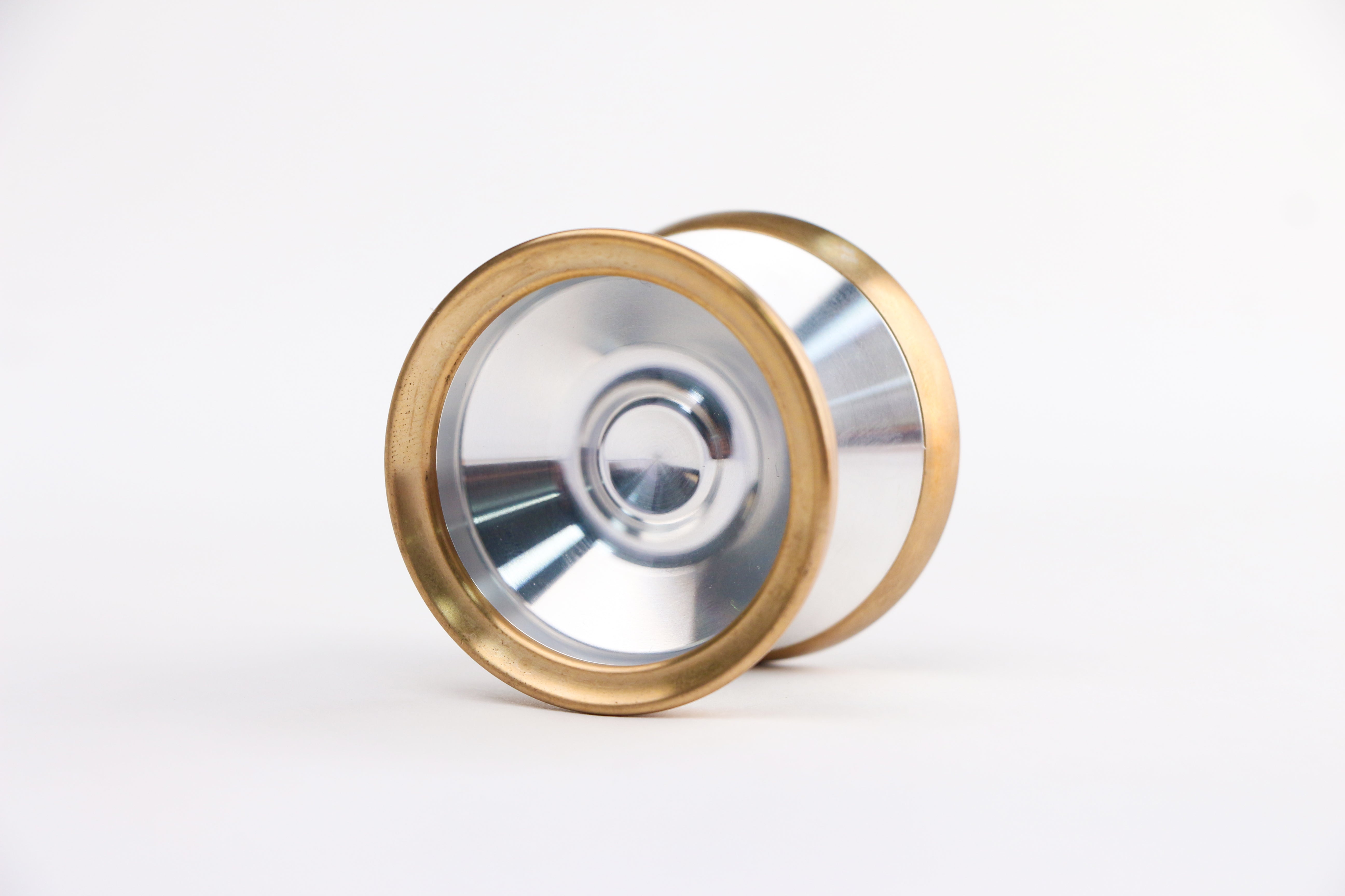 Firstly the construction of the yoyo we first immediately thought of 7068+SS. Our signature construction in both performance and manufacturing. Then from the experience of our compact to undersized yoyo, the power and stability will drastically decrease and the only way to effectively counteract that is rim weight. We then used that philosophy and thought of, what if we use a material even denser than stainless steel for the rim? We have two choices here, brass and copper. Copper is the most dense material in our arsenal and one of our most ambitious manufacturing feats, but the cost is too high. We settled with brass for cost and still more dense than stainless steel.