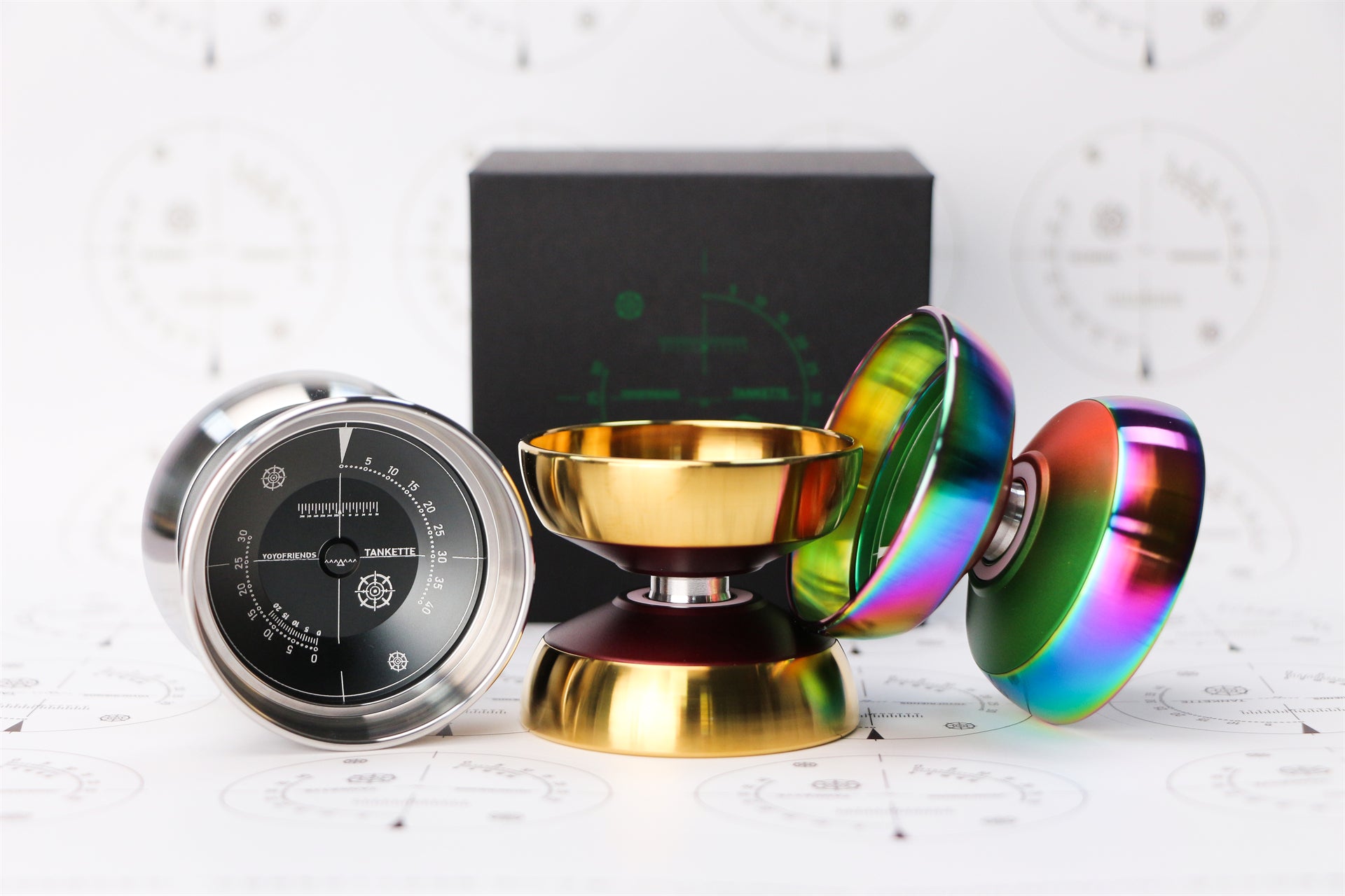 Introducing the yoyofriends Tankette, a light and fun undersized throw with an extreme weight distribution . Tankette is our imagination of maximizing the weight and size of the rim. Even at its small stature, over three-quarters of the weight of the yoyo is stainless steel. The result is a very unique feel and never-before-seen performance at this size and weight. While playing the tankette, you will feel the stability and the speed of a full-size competition yoyo. It is also very light so you can enjoy a never-before-seen performance for a prolonged period of time without getting tired.